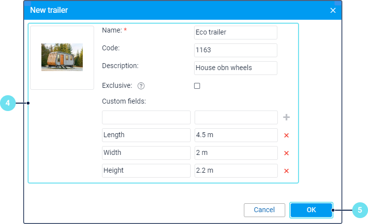 Specify the properties of the trailer: name, automatic assignment code, description. If necessary, enable the Exclusive option, add custom fields, and upload a PNG, JPG, GIF or SVG image. The properties of a trailer are similar to those of a driver.