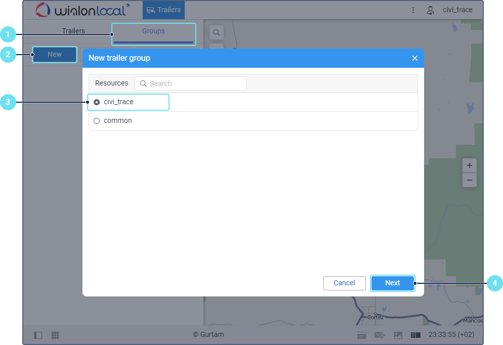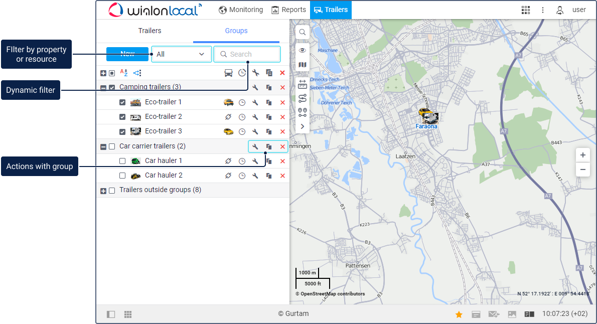 . To quickly find the required trailer group, use the dynamic filter or the filter by property (assigned or not assigned trailers) or by resource.