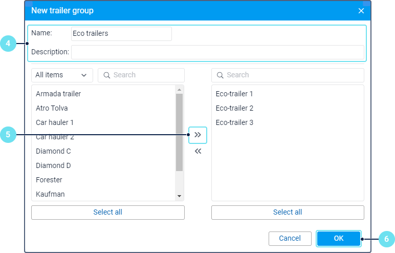 Select the trailers which should belong to the group. To do this, select the required ones in the list on the left and move them to the list on the right by clicking on the icon