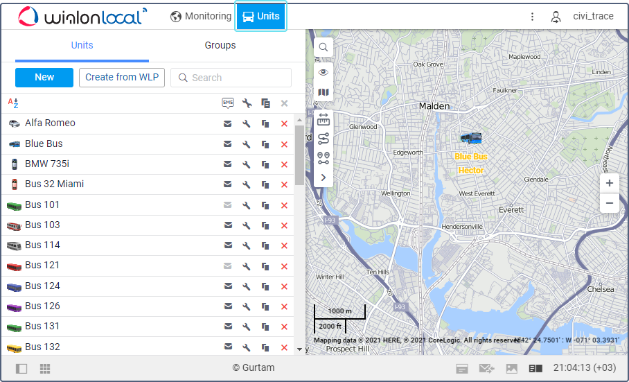 On the Units tab, you can create units and unit groups to monitor them later on the Monitoring tab. Here you can also perform the following actions with units: sending SMS messages, editing unit properties, copying, and deleting. There is a dynamic search which works by unit name on the tab.