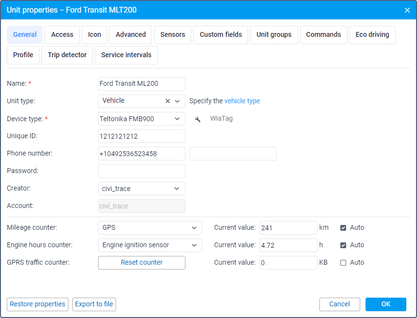 The window of unit properties is shown when creating, editing, and copying a unit. In this window, you can specify different unit properties, configure access to the unit, create sensors, and so on.