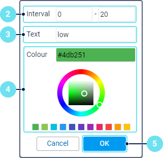 In the From field, enter the initial value of the first interval, select a colour for it, and specify a caption. If the From field is empty, it is considered that -∞ is specified there.