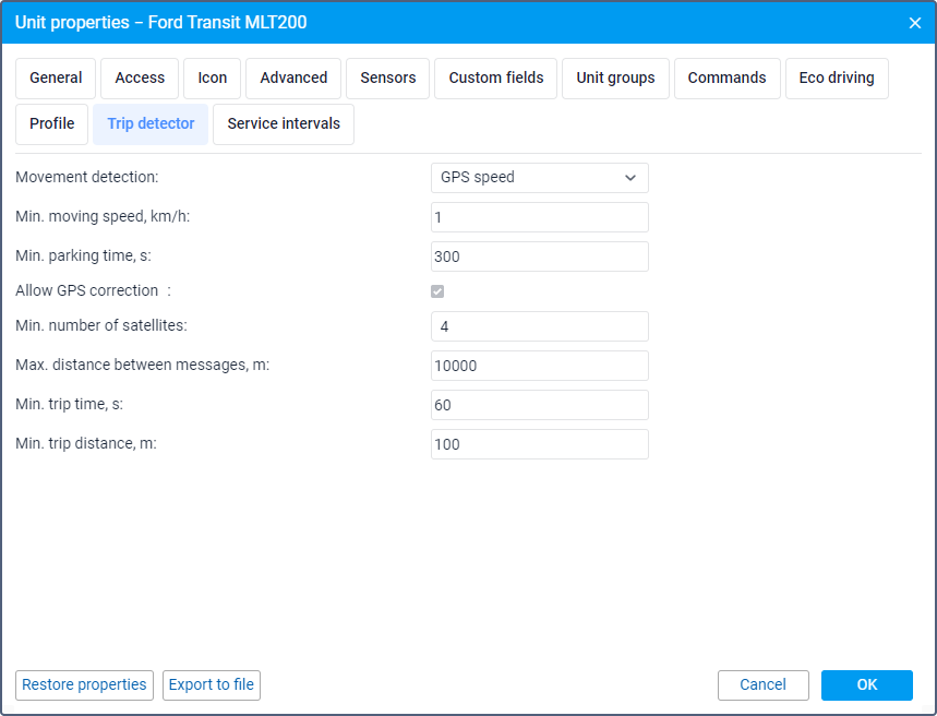 The parameters of the trip detector are used to determine movement, trip, stop and parking intervals.