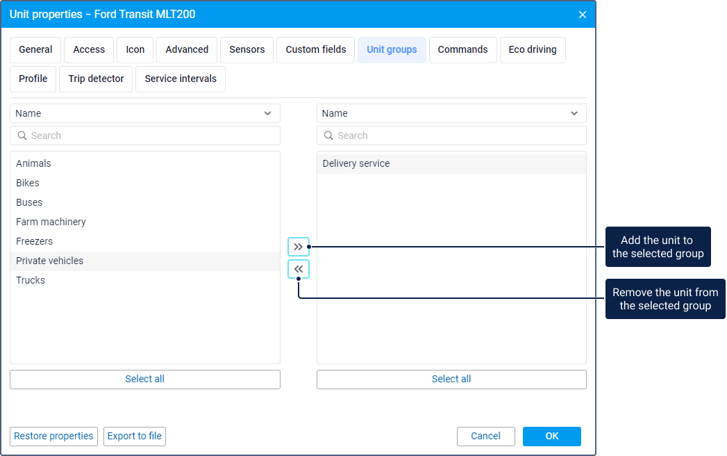 To add the unit to a group, move the group from the left list to the right one; to remove, vice versa. To move groups, use the icons