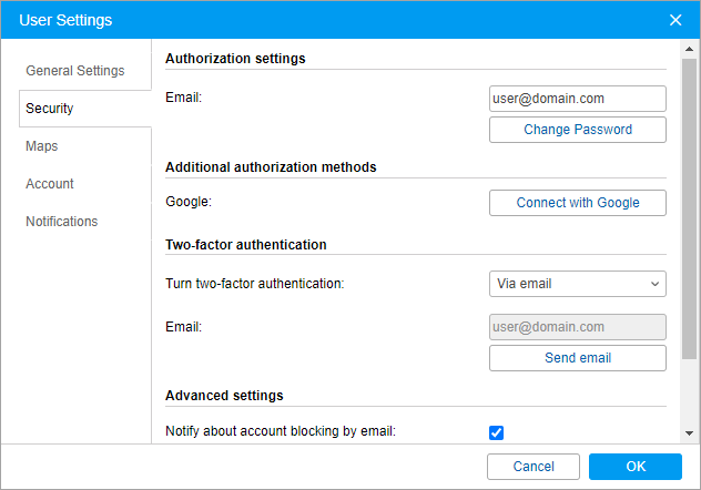 To enable two-factor authentication, in the drop-down menu select the method of receiving the confirmation code: via email or SMS.