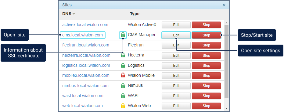 The Sites section is a table where the DNS and type of each site are specified. To open the required site, click on its DNS link.