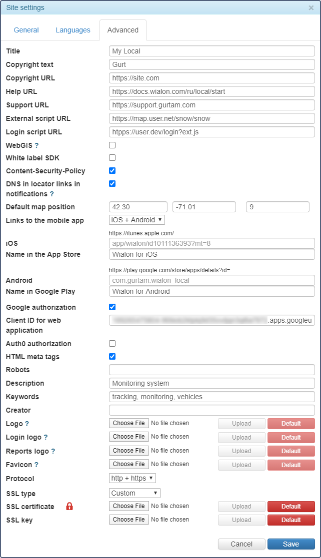 | Protocol | The protocol used (http, http + https, https). For the https protocol, you can add an SSL certificate and an SSL key. For an SSL certificate, indicate its type (Custom, Let's Encrypt, or Self-signed). In case of selecting Let's Encrypt or Self-signed, you do not have to upload the certificate yourself because it is generated automatically. To work using the https protocol, the site (Wialon Web or CMS Manager) indicated in the Base URL field on the General tab is also required to work with it (that is, either http + https or https should be selected in the Protocol field). |