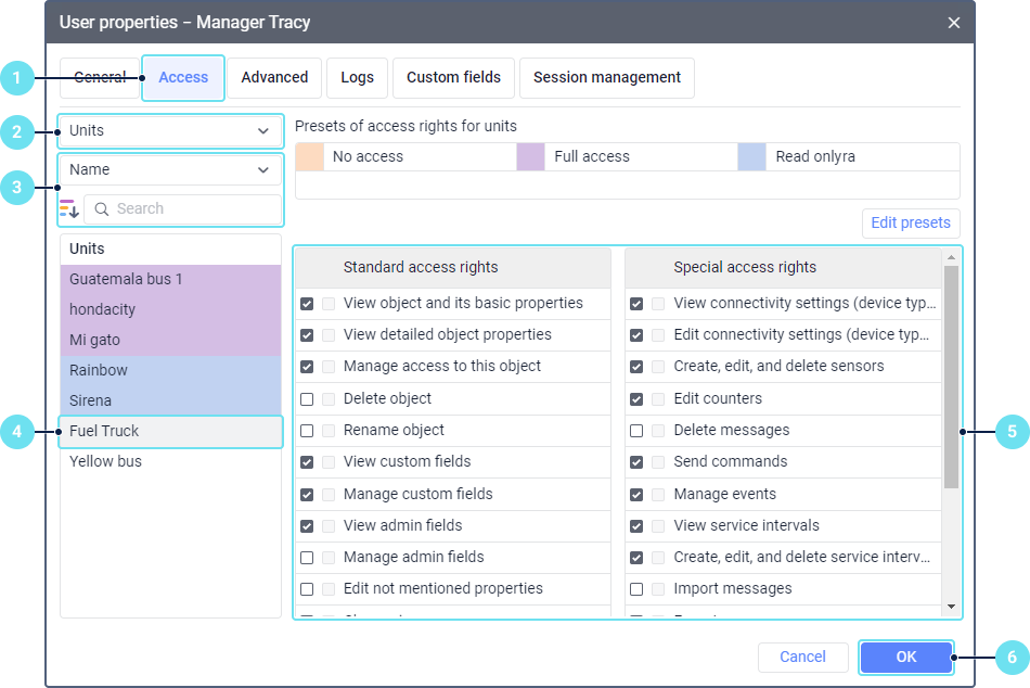 You can grant access rights to a unit, unit group, or resource (account) either in the properties of this object or in the properties of the user to whom access is given. Access rights to users and routes can be granted to a user only in the user properties. These two methods and the particularities of granting rights are described below.