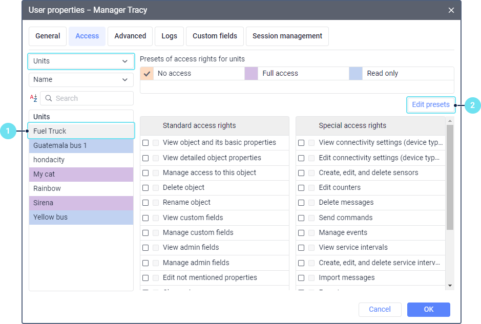 In the example below, we create a preset in the properties of a user to who should get access rights to a unit. You can also create a preset from the properties of the unit, that is, of the object to which the user should get access (except for routes and users).