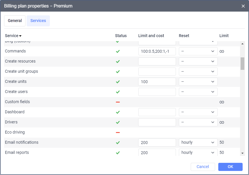 Limit and cost | In this column, you can specify the values of the service quantity and cost. For example, if you specify number 100 for the Units service, this means that no more than 100 units can be created in the accounts to which this billing plan is assigned. You can indicate the limit and cost for the billing plan in the same way as for the account. You can also specify the service limit and cost individually for each account on the Services tab of its properties. These values can be more than the values from the billing plan properties, but not more than the values from the Limit column. |