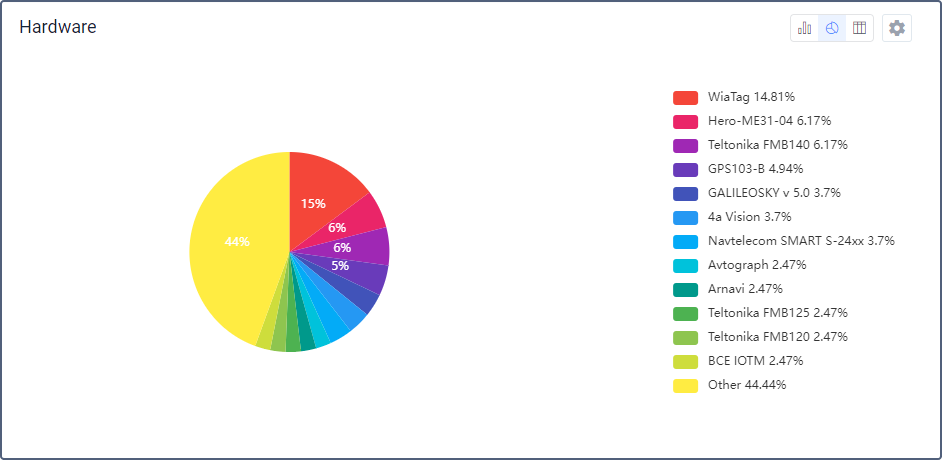 This block contains the information about the added or deleted units with a certain type of hardware. The Hardware graph data can be presented in the form of a bar or a pie chart, or a table.