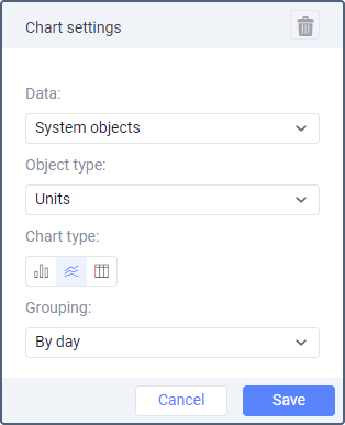 The data of the System objects graph can be presented in the form of a bar or a line chart, or a table and grouped by days/weeks/months/quarters.
