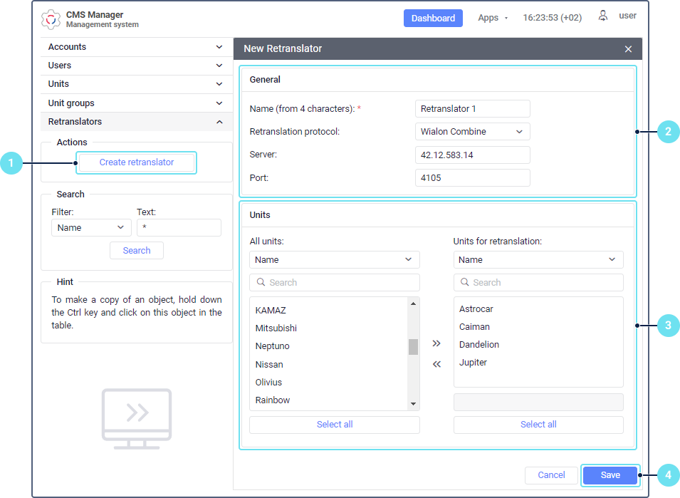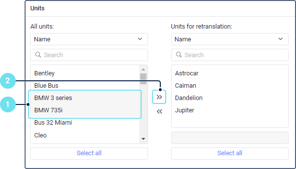 In this section, select units for data transmission. To do this, select the necessary ones in the All units list and move them to the Units for retranslation list using the icon . To select all the units at the same time, click Select all. You can also use keyboard shortcuts to select all or several units at once. To add one unit for data transmission, just double-click on its name.