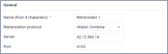 Fill in additional fields (if available). Depending on the selected retransmission protocol, the following fields may be displayed: dispatcher ID, organization ID, auth (authorization), login, password, and so on. For example, for the Nis protocol, you can specify the login and password separated by a colon (login:password) in the Auth field. For some protocols, Secure connection, Disable authorization and other options are available. The Add calculated sensor values ​​option is available for the Wialon Retranslator and Wialon IPS protocols, and the Retransmit fuel data option — for EGTS. When these options are enabled, the retranslators also send the calculated sensor values ​​or fuel data, respectively.
