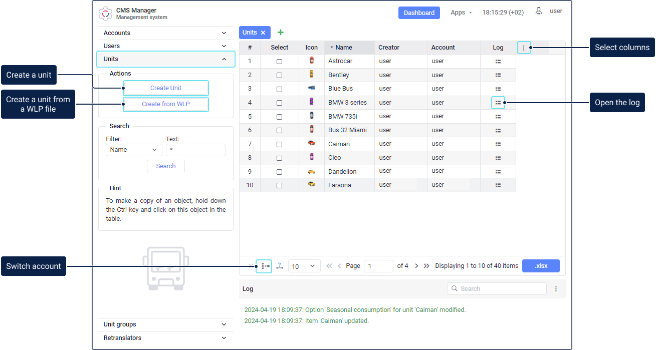 In this section, you can perform the following actions with units: create, deactivate, transfer them from one account to another, etc.