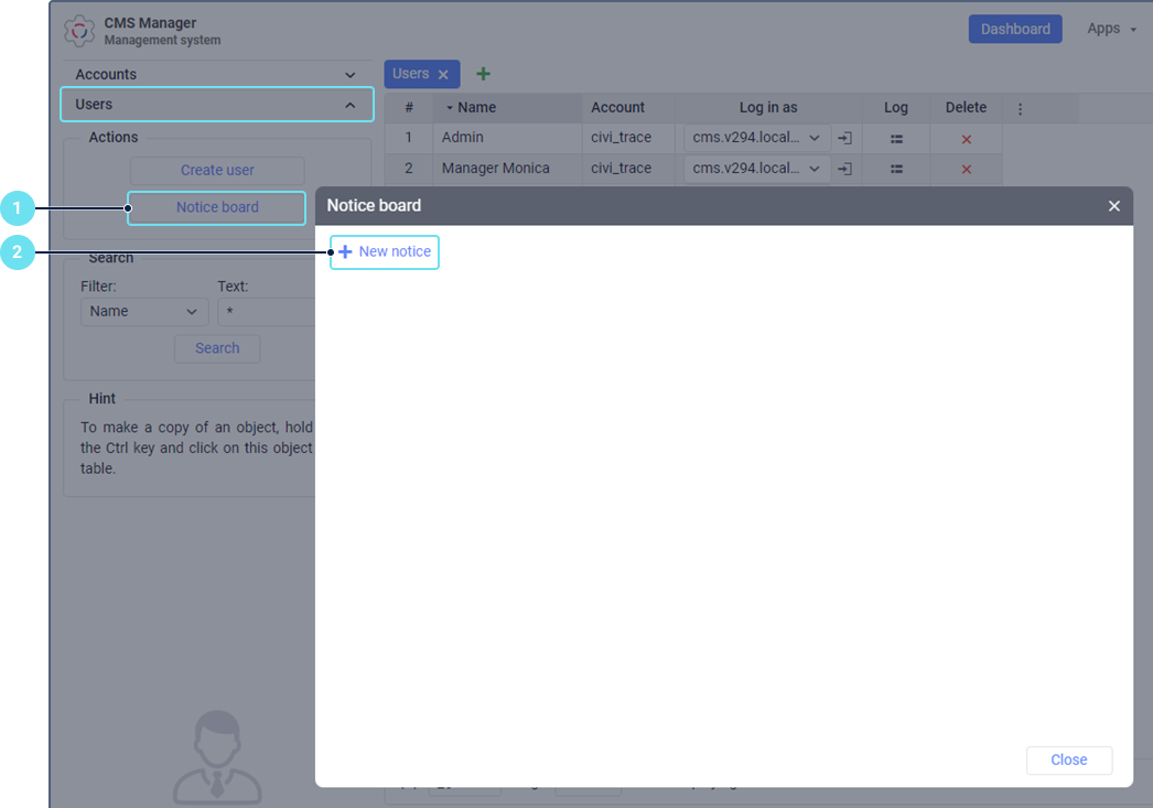 In the Notice board window, you can create information messages (notices) and send them to users. Before getting started, consider the following requirements: