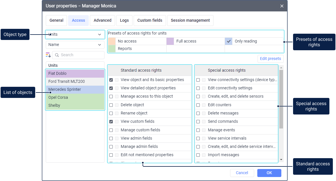 On this tab, you can see and change the access rights of the user to the following types of objects: