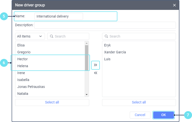 Select the drivers which should belong to the group. To do this, select the required ones in the list on the left and move them to the list on the right by clicking on the icon
