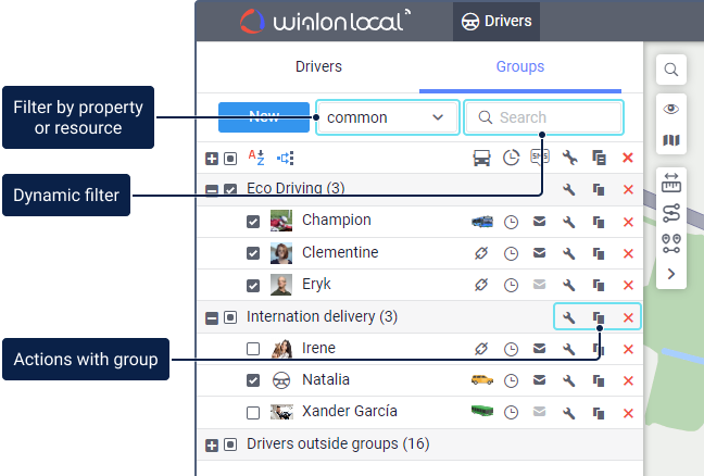 Expand the row of the group to see the drivers belonging to it and perform actions with them. To see the drivers from the group on the map, select this group in the list.