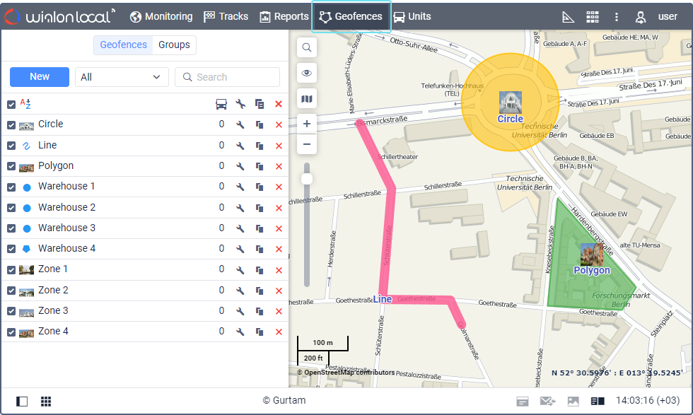 To go to the Geofences tab, click on its name in the top panel or select Geofences in the main menu customizer. On this tab, you can create geofences and their groups, edit, copy and delete them (see Managing geofences).