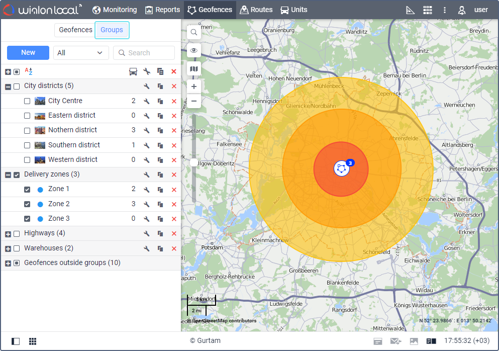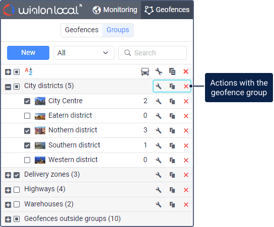 To work with geofence groups, you should have the same access rights as for working with geofences. Geofence groups are used to combine geofences according to certain criteria. In addition, you can use groups as a filter in some report templates and in notifications of the Geofence type. To open the list of groups, use the switch at the top of the workspace.