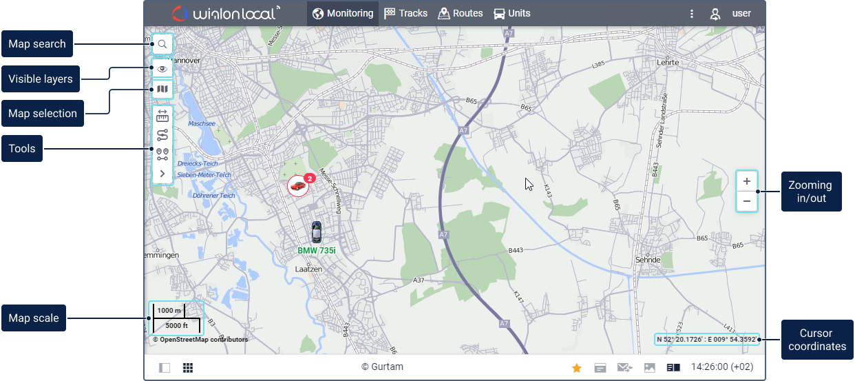 In the lower left corner of the map, the current scale of the map is indicated. In the lower right corner, you can see the geographical coordinates of the place the cursor points at. The coordinate format is selected on the Maps tab in the user settings and can be either degrees or degrees and minutes.