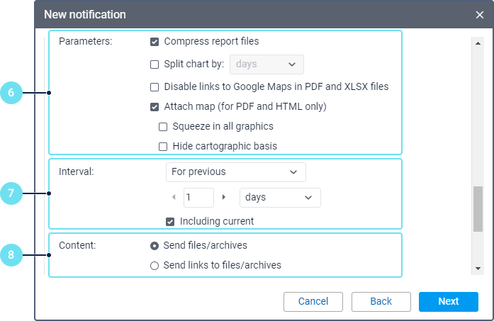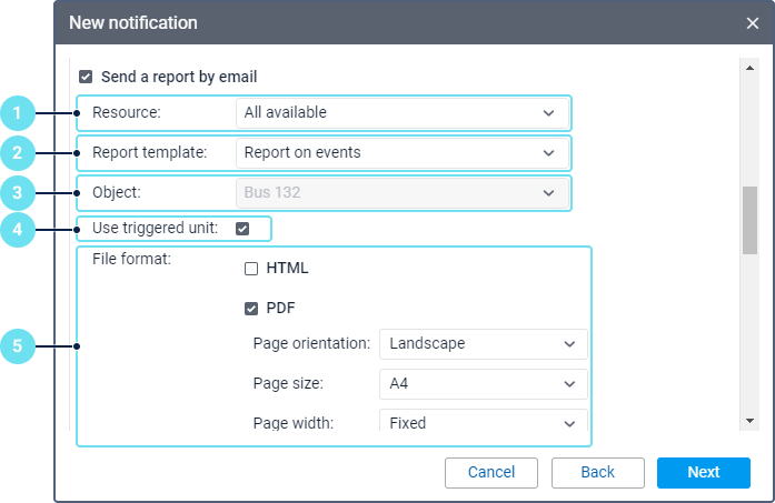 If necessary, enable the Triggered unit option. It is only available for reports on unit or unit group. If the option is enabled, the report is executed only on the unit that triggered the notification, regardless of the object selected in the previous list.