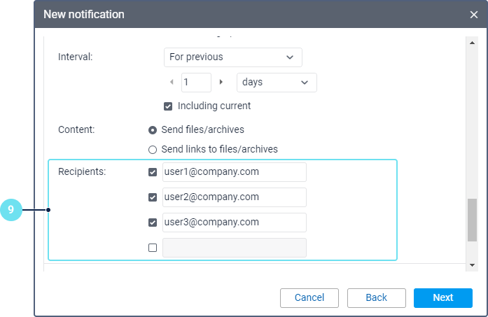 - Specify and select the email addresses of the recipients of the report. A new field is added automatically after each input.