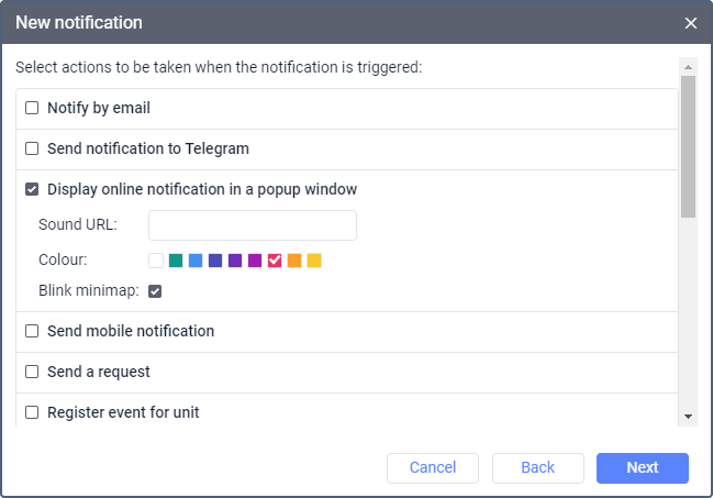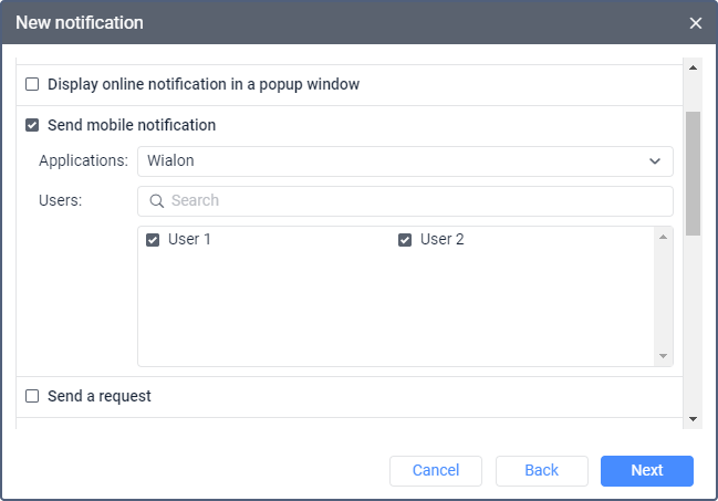 This notification action allows you to display notifications in a pop-up window in Wialon (see more).
