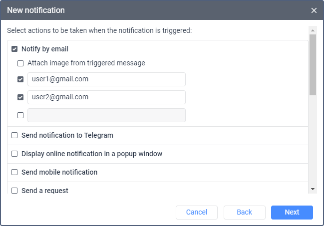 This action allows you to configure sending email notifications. To do this, check the box to the left of the field and specify the address to which notifications should be sent. A new field is added automatically after each input. To cancel sending notifications to any of the specified addresses, uncheck the box to the left of the required address.
