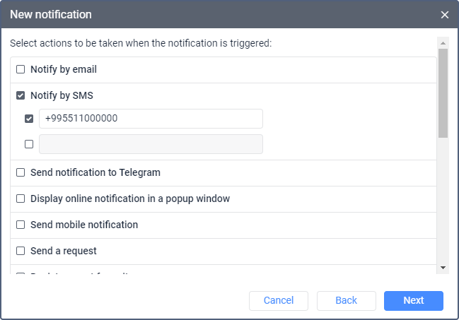 In the notification properties, you should select and configure one or several actions that should be performed automatically when the notification is triggered.