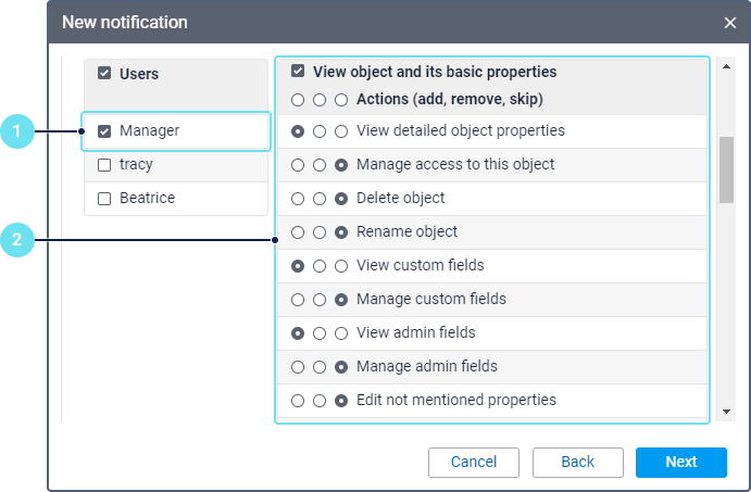 | User access rights | View detailed object properties | The user who configures the notification should have these access rights to the recipient users and to the user-creator of the resource in which the notification is stored. The user-creator of the resource in which the notification is stored should have these access rights to the recipient users. |
