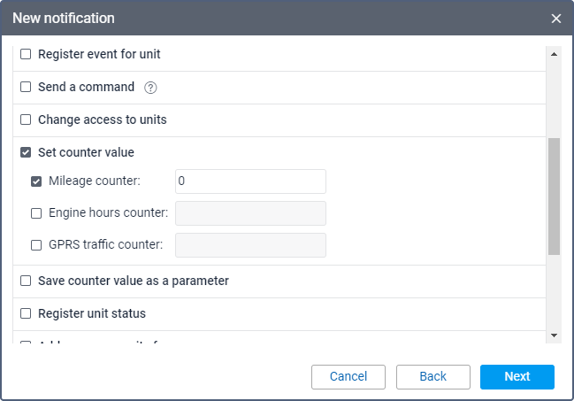 This action allows you to change the values of the mileage, engine hours, and/or GPRS traffic counters. To do this, you should have the Edit counters access right to the unit.