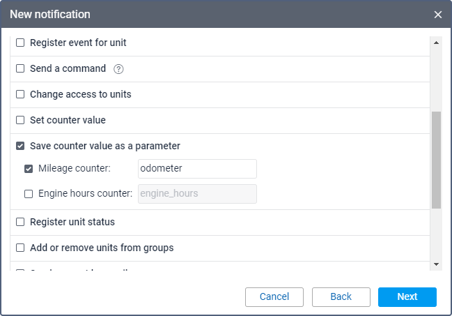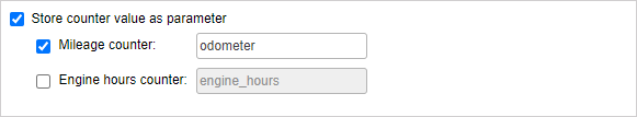 This action allows you to save the value of current mileage (odometer parameter) or engine hours (engine_hours parameter) as a parameter in the message. This is required in order to show the initial and final mileage values in the report on trips and convert the engine_hours parameter into the engine hours sensor for further operations. To do this, you should have the Edit counters access right to the unit.