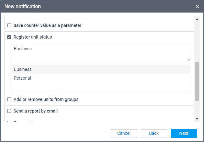 This action allows you to register the unit status: Business or Personal. To do this, you should have the Manage events access right to the unit. For example, when the unit visits a certain geofence, the unit status can be changed from personal to business or vice versa.