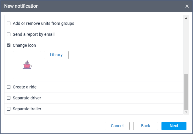 This action allows you to select the icon that should be the unit icon when the notification is triggered. To open the list of available icons, click on the Library icon.
