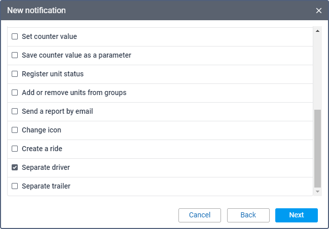 This action allows you to automatically separate the driver from the unit. If several drivers are assigned to a unit, all of them are separated after the notification is triggered. The drivers and the notification should belong to the same resource.