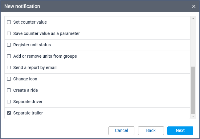 This action allows you to automatically separate the trailer from the unit. If several trailers are assigned to a unit, all of them are separated after the notification is triggered. The trailers and the notification should belong to the same resource.
