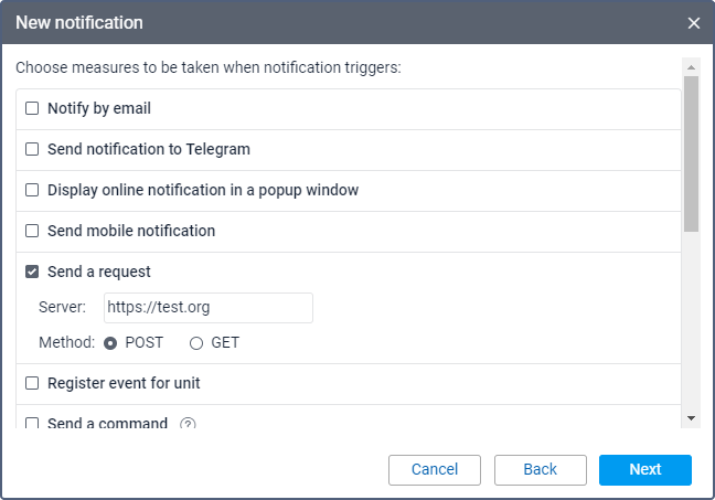 - In the notification text field, specify the dynamic part of the request using tags. For example: param1=value1¶m2=value2¶m3=%UNIT%¶m4=%SPEED%
