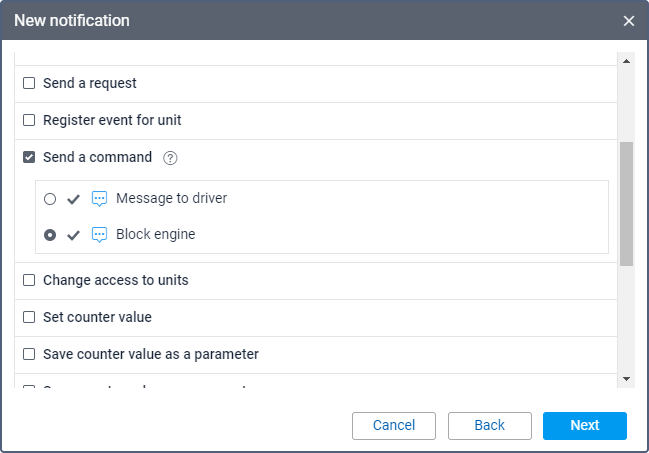 This action allows you to send a certain command to the unit(s). The list contains all the available commands created in the properties of all the selected units if you have the Send commands access right to them.