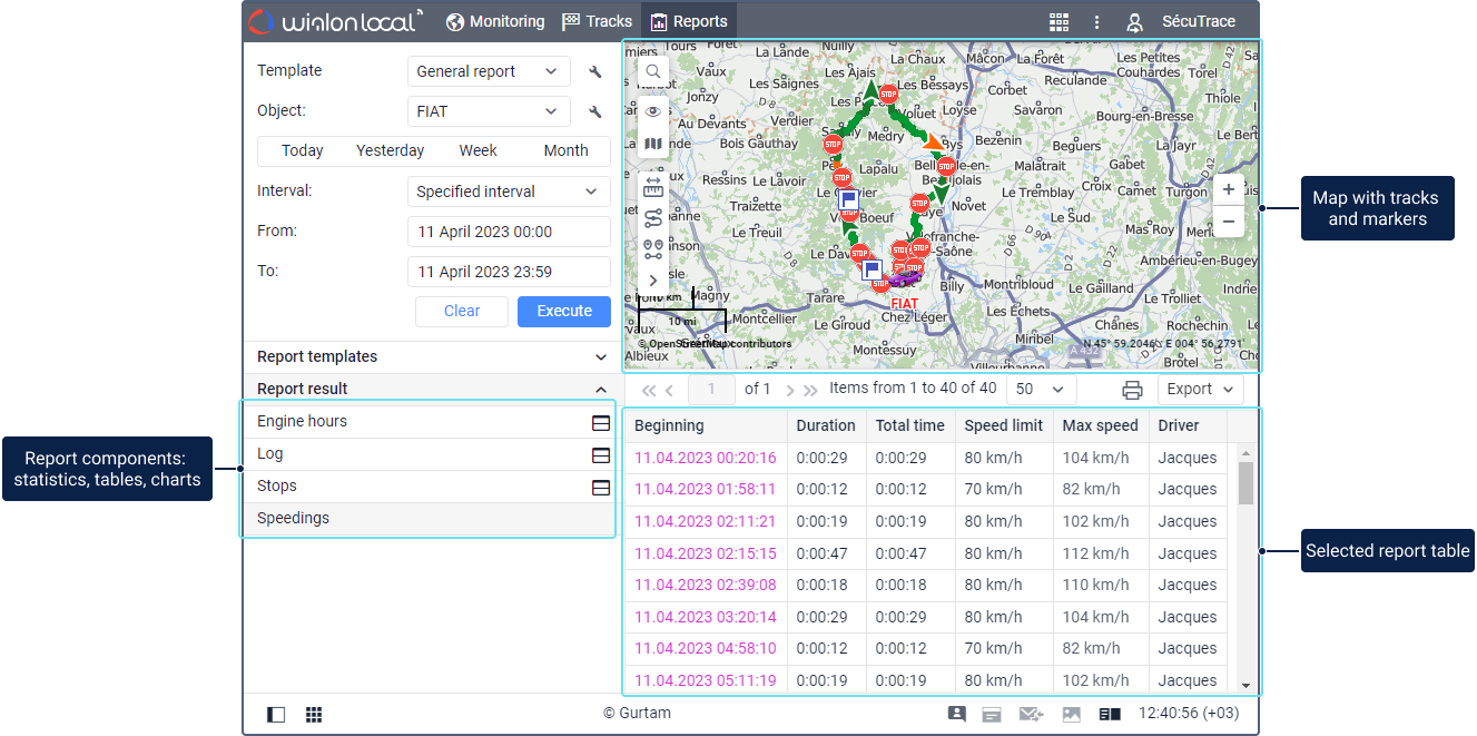 - Reports can include the following components: tables, charts, statistics, a map with tracks marked on it and markers of stops, fuel filling and other actions with the unit.