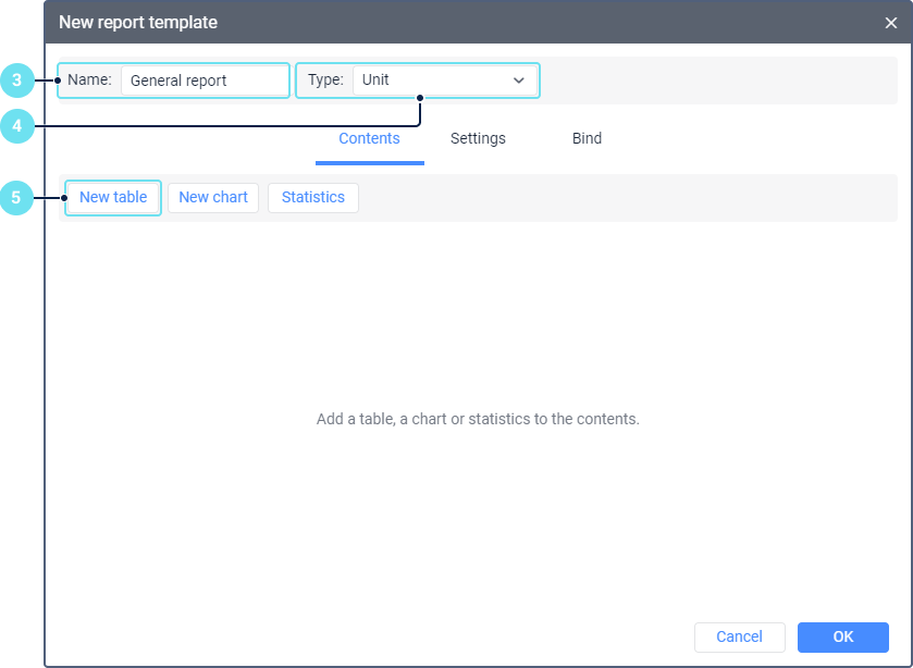 On the Contents tab, click New Table to add a table. It will present the main data of the report.