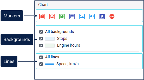 This section displays the markers selected in the chart settings. The tooltip of each marker shows the type of events it denotes. If several fuel level sensors are configured for a unit, the fuel filling and drain markers corresponding to each of them have a numeric indicator.