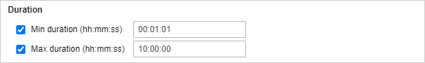 This filter consists of the Min duration and Max duration fields where you can specify the minimum and maximum duration of the intervals to be shown in the report. The maximum allowed value for this filter is 999 h 59 min 59 s (about 41 days and 16 hours).
