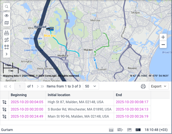 | Sum up intervals | This option can only be used if the Min duration and/or Max duration fields are filled in. If it is enabled, then all the periods during which the sensor was on or off within the report interval are summed up and the result is compared with the specified duration value. If the amount matches the condition, the interval is shown in the report. Example. A report on trips with the sensor on is executed. A value of 60 seconds is indicated in the Min duration field. The Sum up intervals option is activated. During the trip, the sensor was on for 20 seconds, for 30 seconds and for 15 seconds, that is, for a total of 65 seconds. This value meets the minimum duration condition, therefore, the trip is shown in the report. |