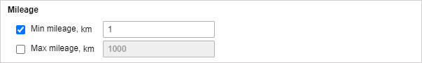 Here in the Min mileage and Max mileage fields, you can specify the maximum and/or minimum mileage required for the interval to be included in the report. Fractional values are allowed, with a point as a separator.