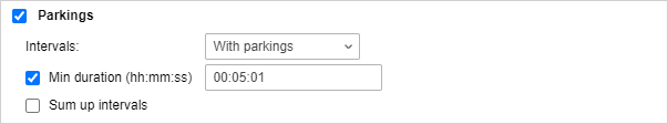 If the With parkings option is selected, you can specify the minimum parking duration in the Min duration field in order for the interval to be included in the report. If the Sum up intervals option is enabled, the duration of all the parking periods within the interval is summed up and compared with the specified minimum duration.