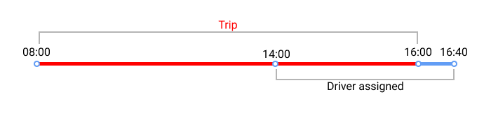 Example 1. The With driver filter is used in a trip report. The trip lasted from 08:00 to 16:00. The driver was assigned to the unit at 14:00 and separated from it at 16:40. If the Retrieve intervals option is disabled, the report shows the entire trip from 08:00 to 16:00.