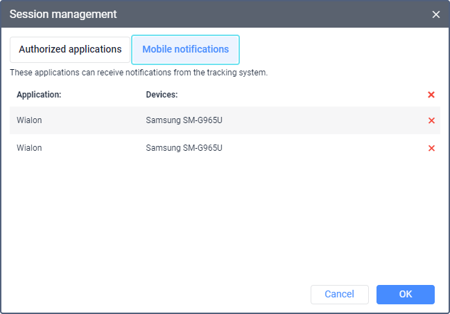 The Session management window shows the list of applications that have access to your account and the list of devices that can receive mobile notifications from Wialon. The lists are formed automatically after logging in to the application.