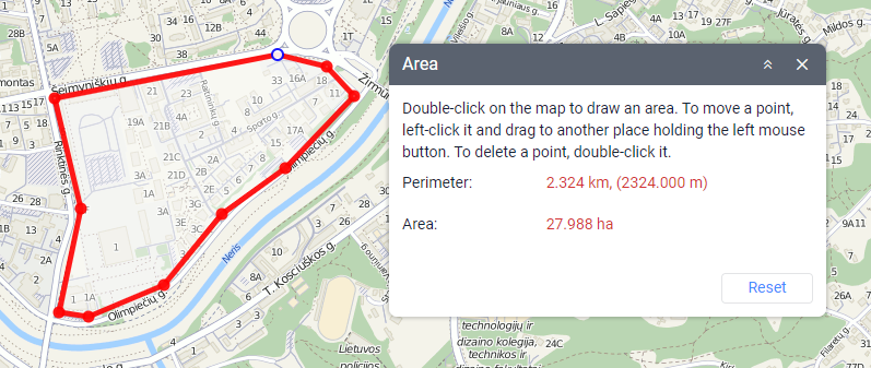 This tool allows you to determine the perimeter and area of the territories marked on the map.